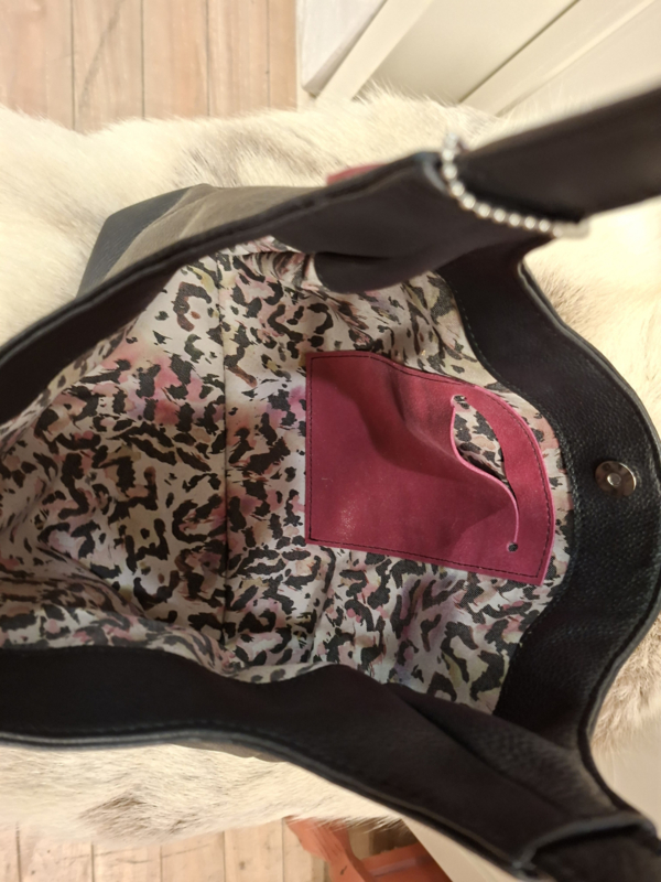 Super leuke tas van soepel zwart runderleer. De tas is gevoerd met roze panterprint stof, sluit d.m.v. een magneetsluuiting en heeft een vakje voor je mobiel.