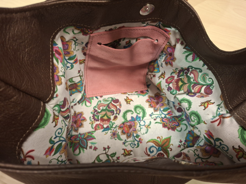 Super leuke tas van soepel chocolade bruin runderleer. De tas is gevoerd met een fleurige bloemen stof, sluit d.m.v. een magneetsluuiting en heeft een vakje voor je mobiel.