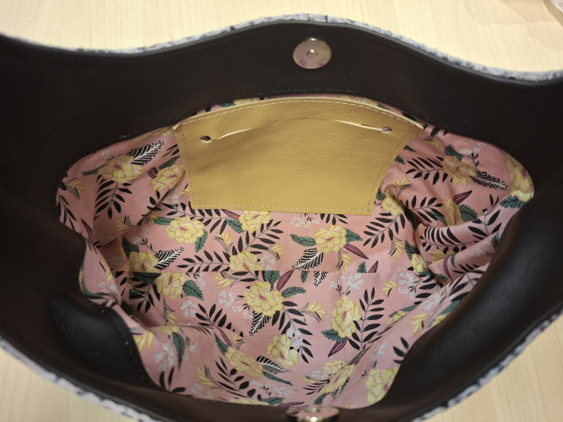 De tas is gevoerd met bloemetjes stof, sluit d.m.v. een magneetsluuiting en heeft 1 vakje in de tas.